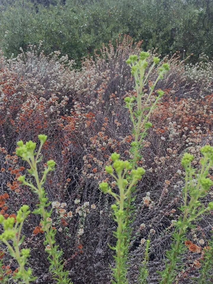 The vegetation at Ballona is changing too. Those plants that bloom after winter rains, like Bush Sunflower and Dune Lupine, have long dropped their blossoms and most of their leaves. This behavior, called Summer Dormancy, is an adaptation that allows native plants to survive in our Mediterranean Climate, one that is characterized by cool wet winters and long dry summers. But the Dune Buckwheat still has a fair amount of blossoms, and the champion late summer bloomers like Coast Goldenbush and Slender Aster are about to burst into a profusion of yellow and pale lavender.
